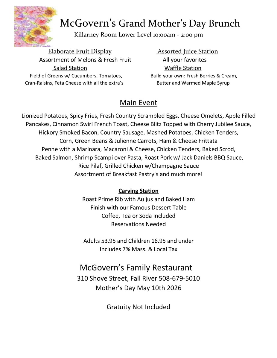 Join us on Mother's Day and treat your mom to a delicious meal! We'll be having a buffet (Reservations Required) for the day in lieu of the dining room. Available from 10:00am to 2:00pm. Call for reservations at 508-679-5010 (Parties of 8+ Require a Deposit, Gratuity not Included)!