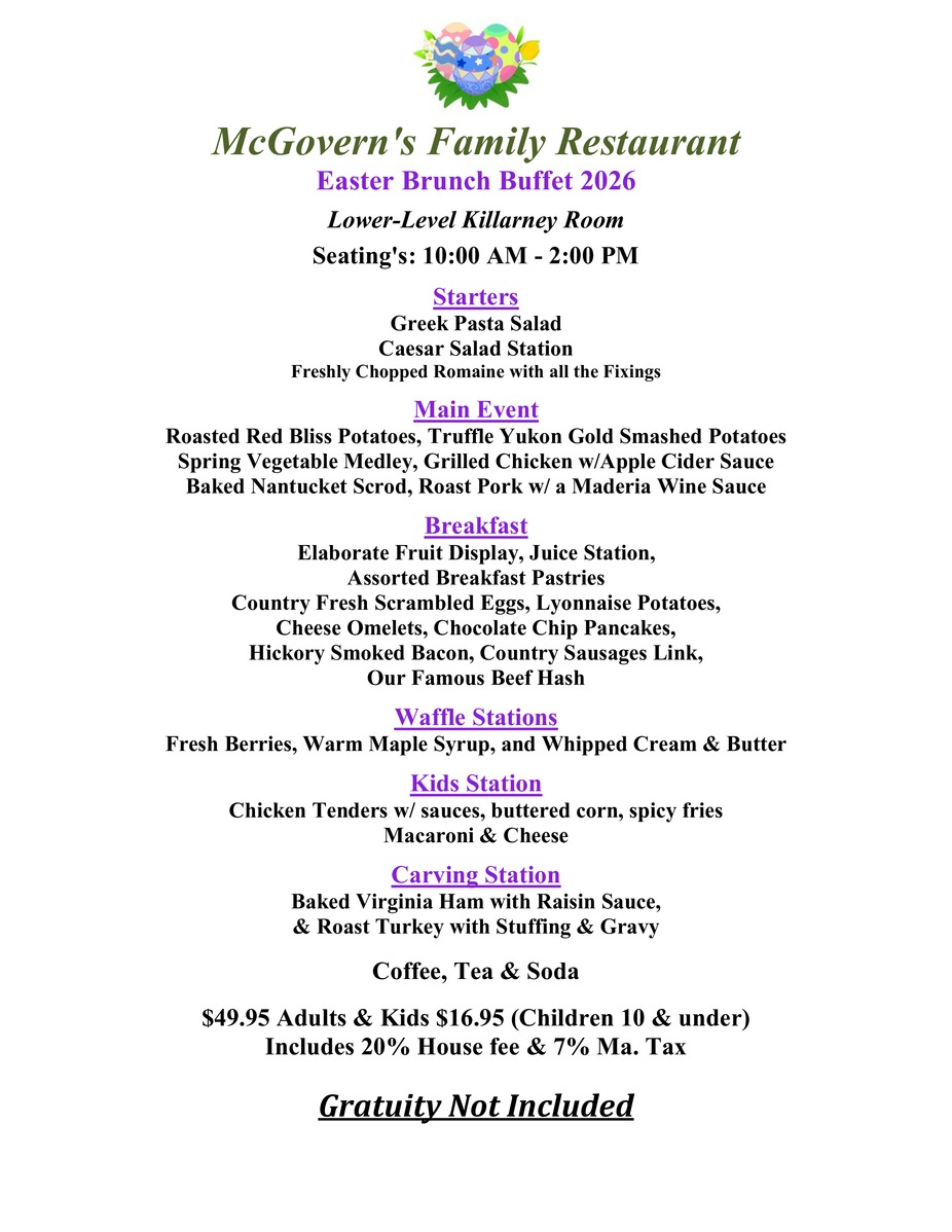 Come celebrate Easter with our Buffet Brunch! Call for more info 508-679-5010! Our Buffet is our only dining option for Easter Day and is available from 10am to 2pm. Reservations Required.